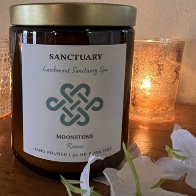 Our custom Larchmont Sanctuary Meditation Spa Candle includes a polished Moonstone hidden in the bottom. This candle promotes deep relaxation, calm and inner peace.